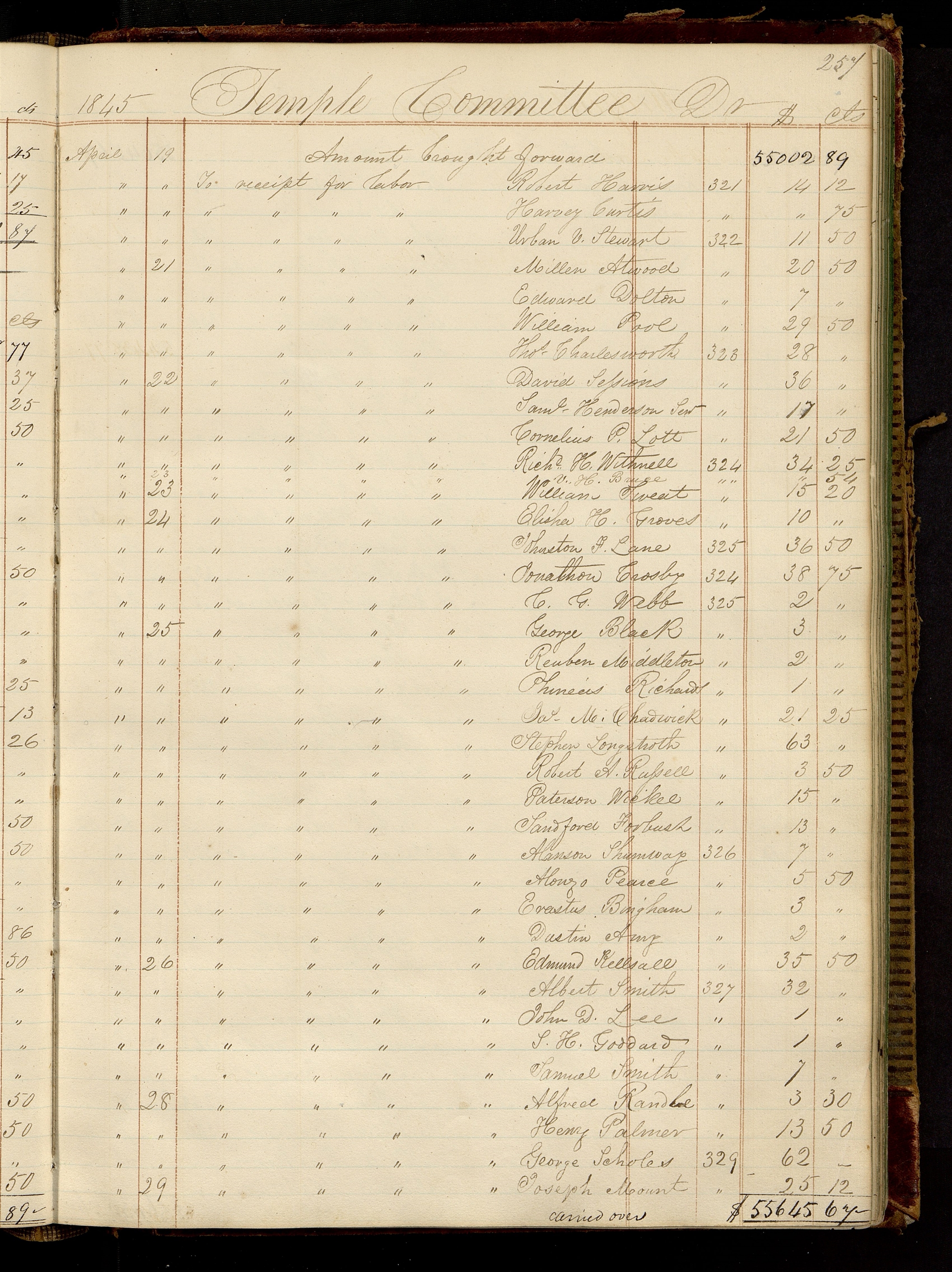 This likely led to the inscription of “Temple Committee Book A” on the spine of the volume. Some have mistaken this as an indication that this record book belonged to the Nauvoo temple committee; however, these are not temple committee records but rather accounts between the trustee-in-trust office and the Nauvoo temple committee.