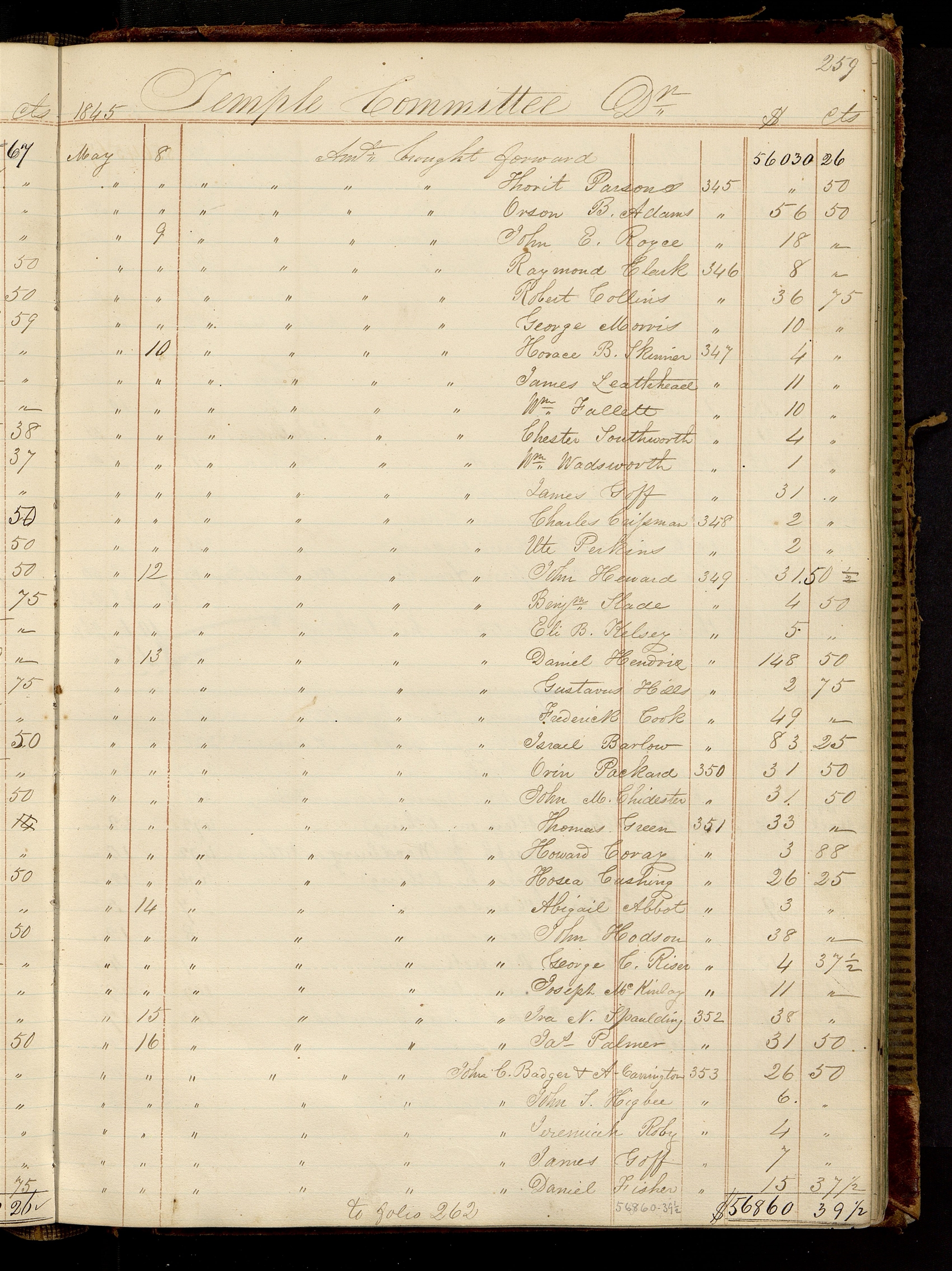 This likely led to the inscription of “Temple Committee Book A” on the spine of the volume. Some have mistaken this as an indication that this record book belonged to the Nauvoo temple committee; however, these are not temple committee records but rather accounts between the trustee-in-trust office and the Nauvoo temple committee.