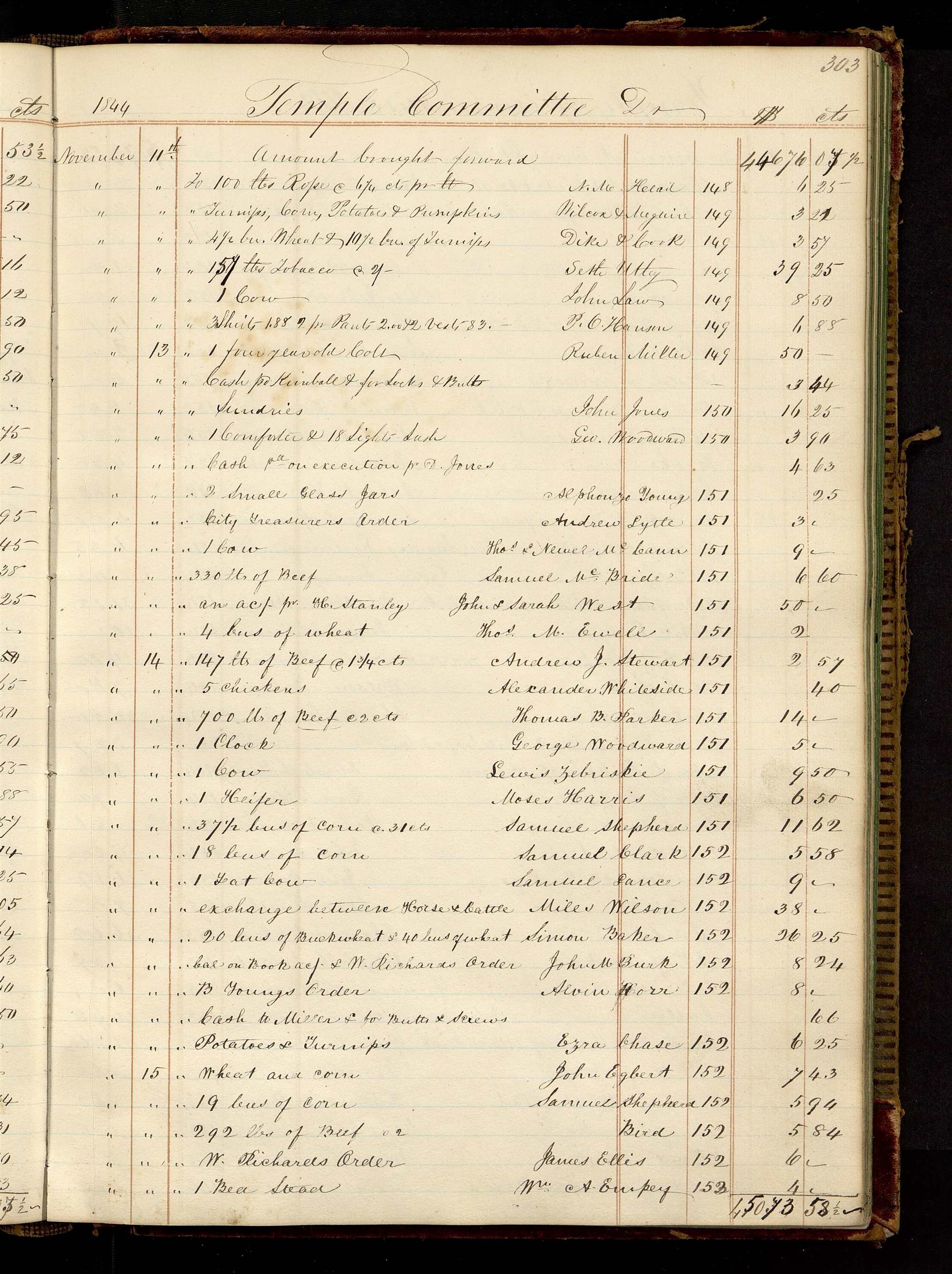 This likely led to the inscription of “Temple Committee Book A” on the spine of the volume. Some have mistaken this as an indication that this record book belonged to the Nauvoo temple committee; however, these are not temple committee records but rather accounts between the trustee-in-trust office and the Nauvoo temple committee.