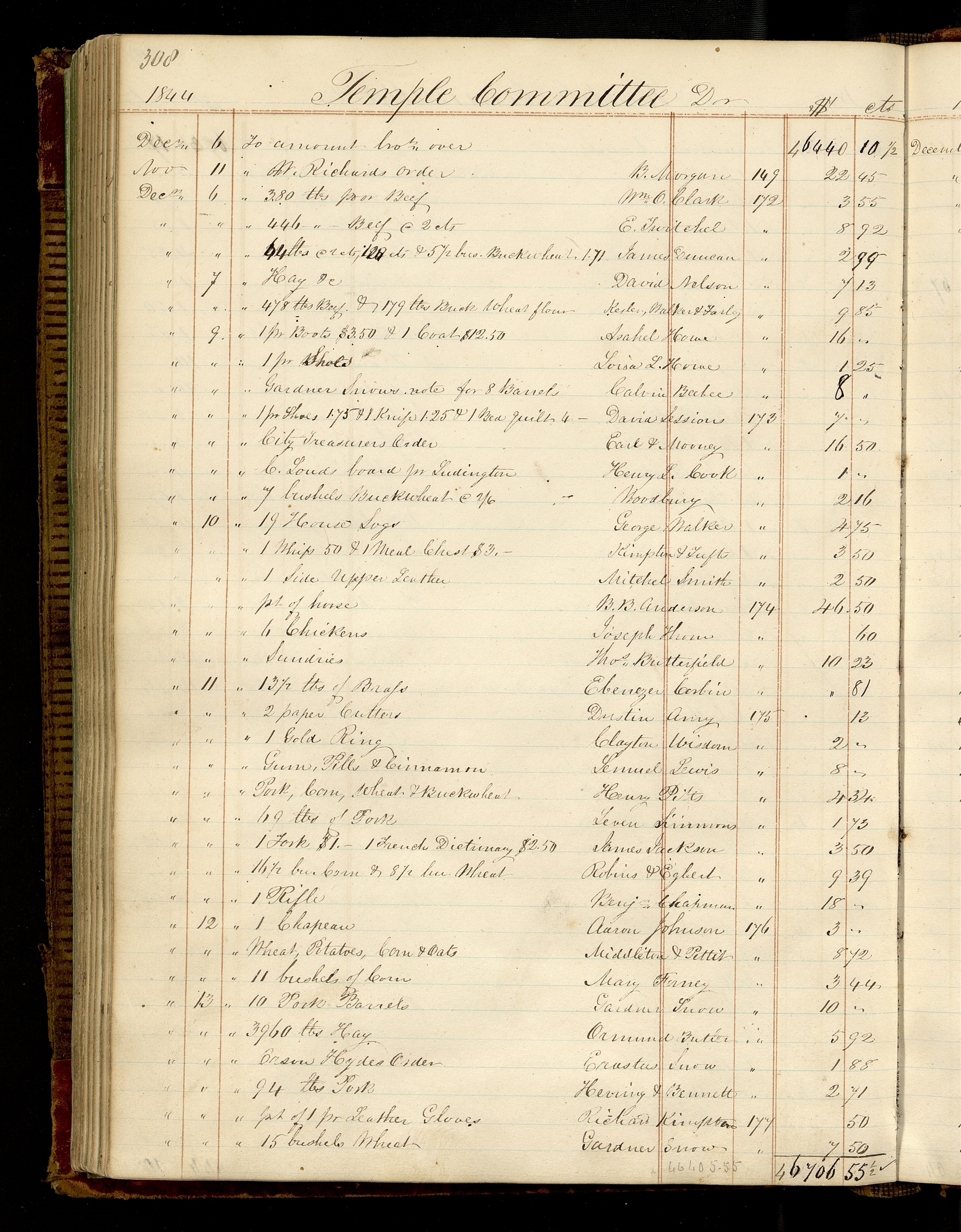 This likely led to the inscription of “Temple Committee Book A” on the spine of the volume. Some have mistaken this as an indication that this record book belonged to the Nauvoo temple committee; however, these are not temple committee records but rather accounts between the trustee-in-trust office and the Nauvoo temple committee.
