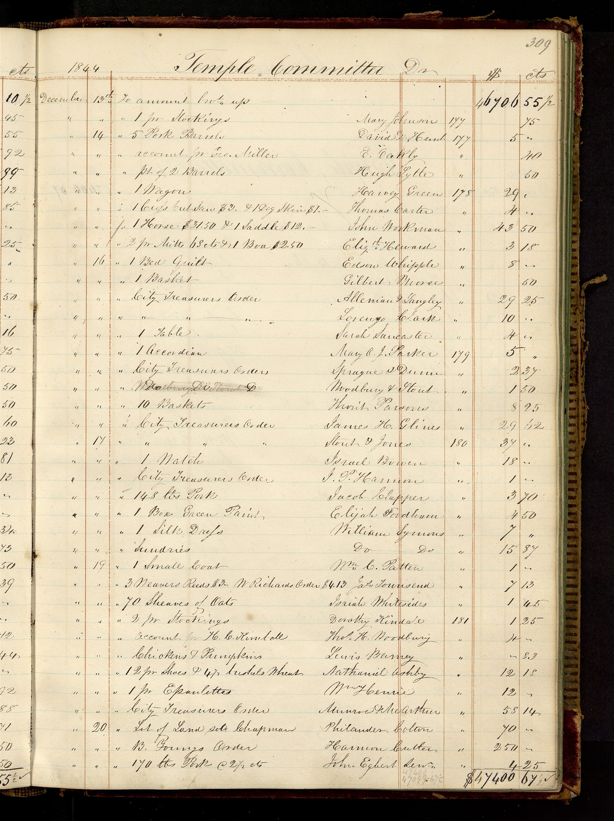 This likely led to the inscription of “Temple Committee Book A” on the spine of the volume. Some have mistaken this as an indication that this record book belonged to the Nauvoo temple committee; however, these are not temple committee records but rather accounts between the trustee-in-trust office and the Nauvoo temple committee.