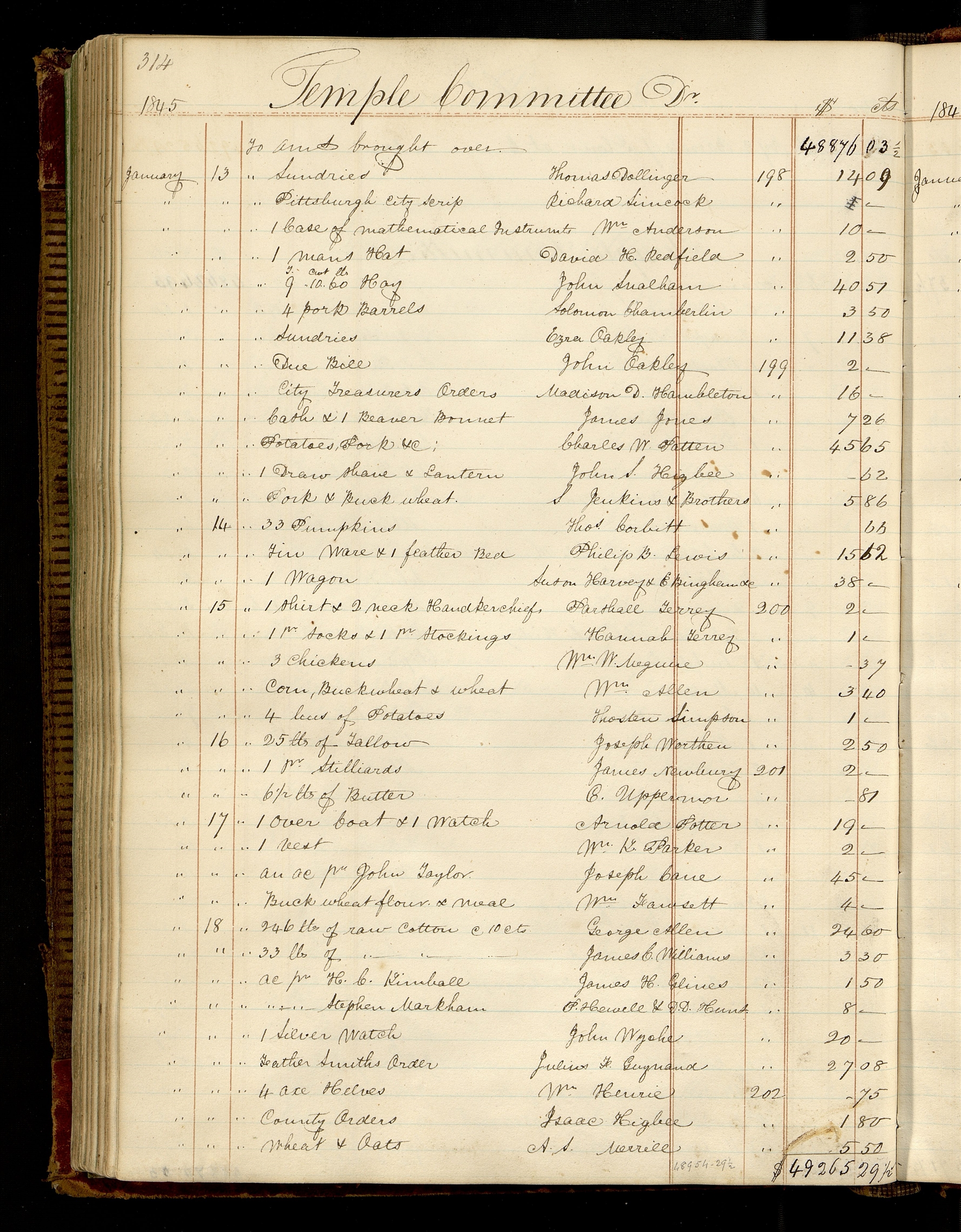 This likely led to the inscription of “Temple Committee Book A” on the spine of the volume. Some have mistaken this as an indication that this record book belonged to the Nauvoo temple committee; however, these are not temple committee records but rather accounts between the trustee-in-trust office and the Nauvoo temple committee.