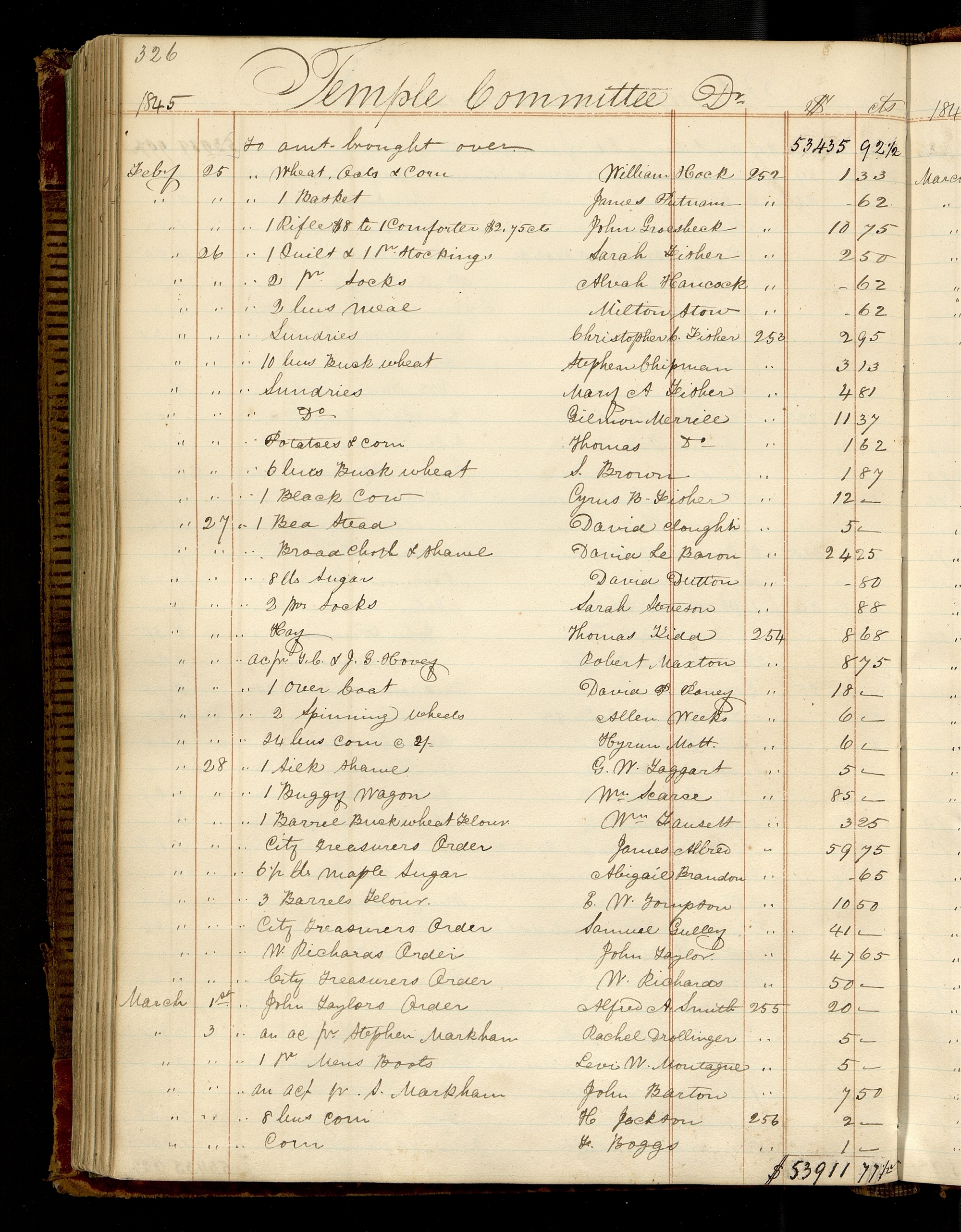 This likely led to the inscription of “Temple Committee Book A” on the spine of the volume. Some have mistaken this as an indication that this record book belonged to the Nauvoo temple committee; however, these are not temple committee records but rather accounts between the trustee-in-trust office and the Nauvoo temple committee.