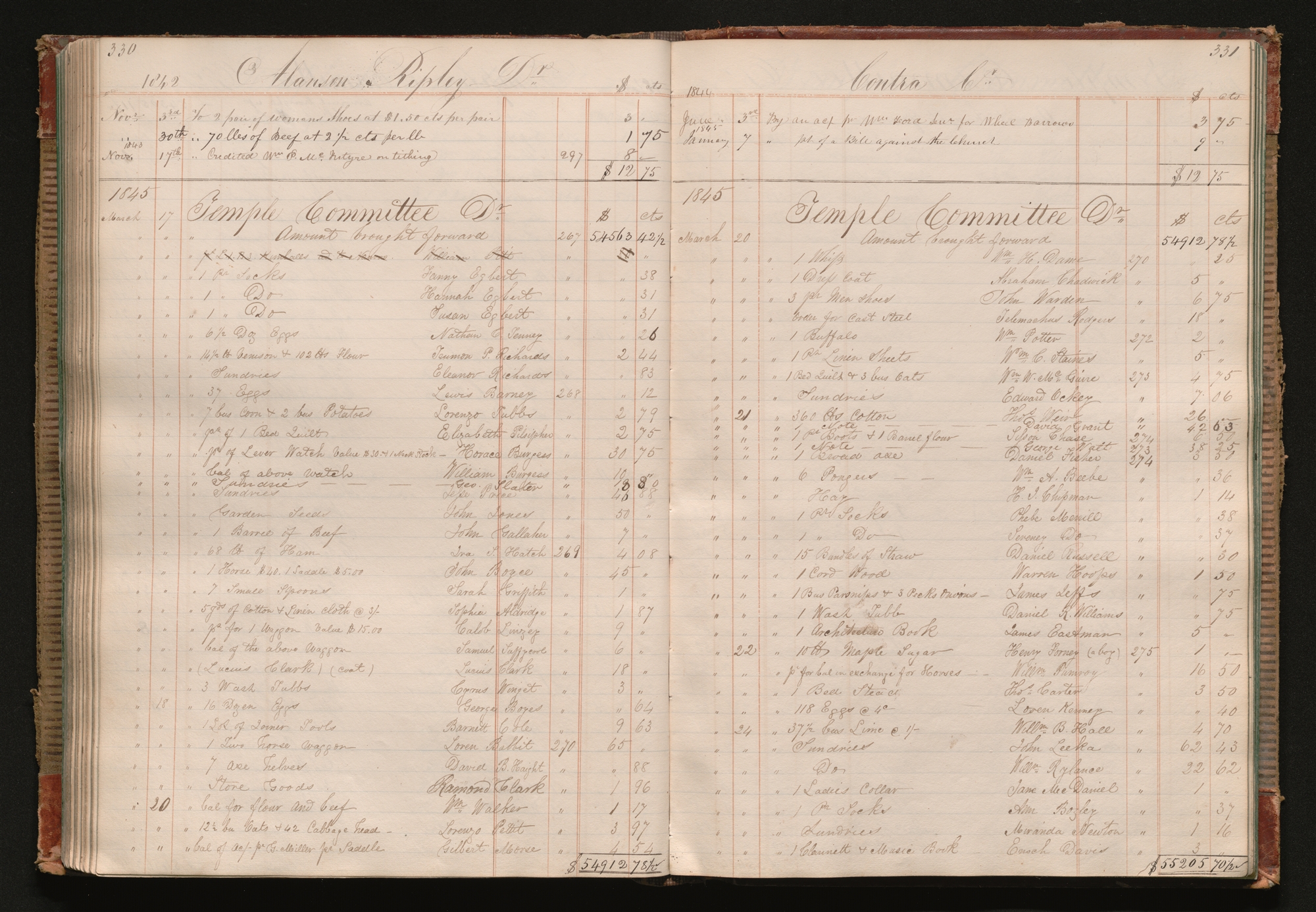 This likely led to the inscription of “Temple Committee Book A” on the spine of the volume. Some have mistaken this as an indication that this record book belonged to the Nauvoo temple committee; however, these are not temple committee records but rather accounts between the trustee-in-trust office and the Nauvoo temple committee.