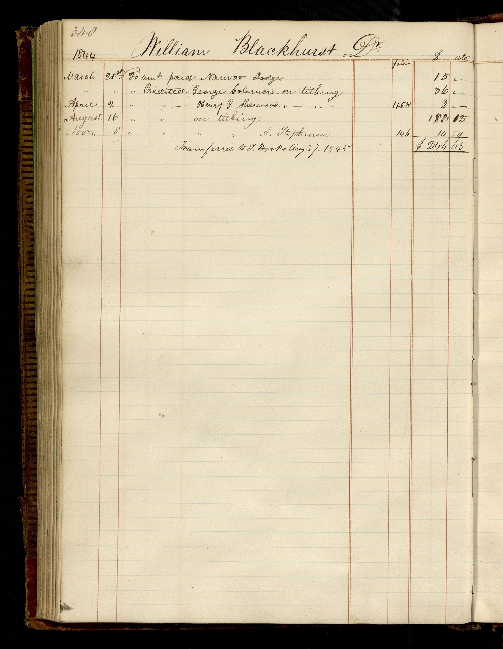 This likely led to the inscription of “Temple Committee Book A” on the spine of the volume. Some have mistaken this as an indication that this record book belonged to the Nauvoo temple committee; however, these are not temple committee records but rather accounts between the trustee-in-trust office and the Nauvoo temple committee.