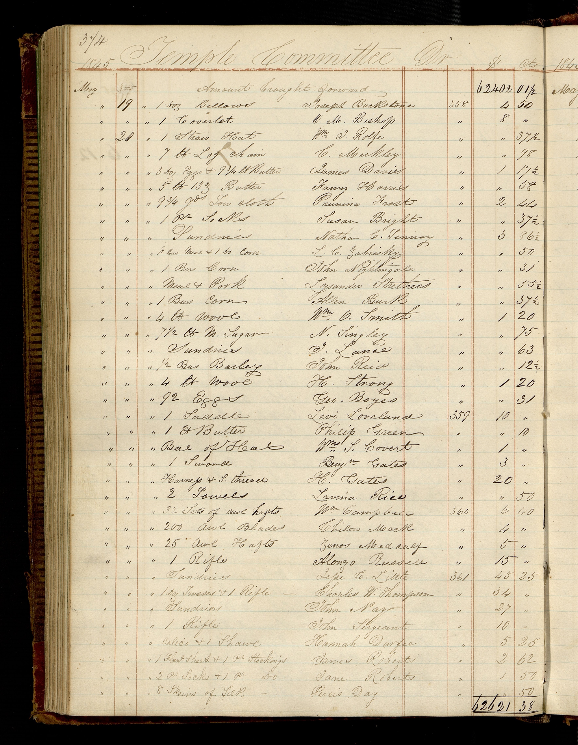 This likely led to the inscription of “Temple Committee Book A” on the spine of the volume. Some have mistaken this as an indication that this record book belonged to the Nauvoo temple committee; however, these are not temple committee records but rather accounts between the trustee-in-trust office and the Nauvoo temple committee.