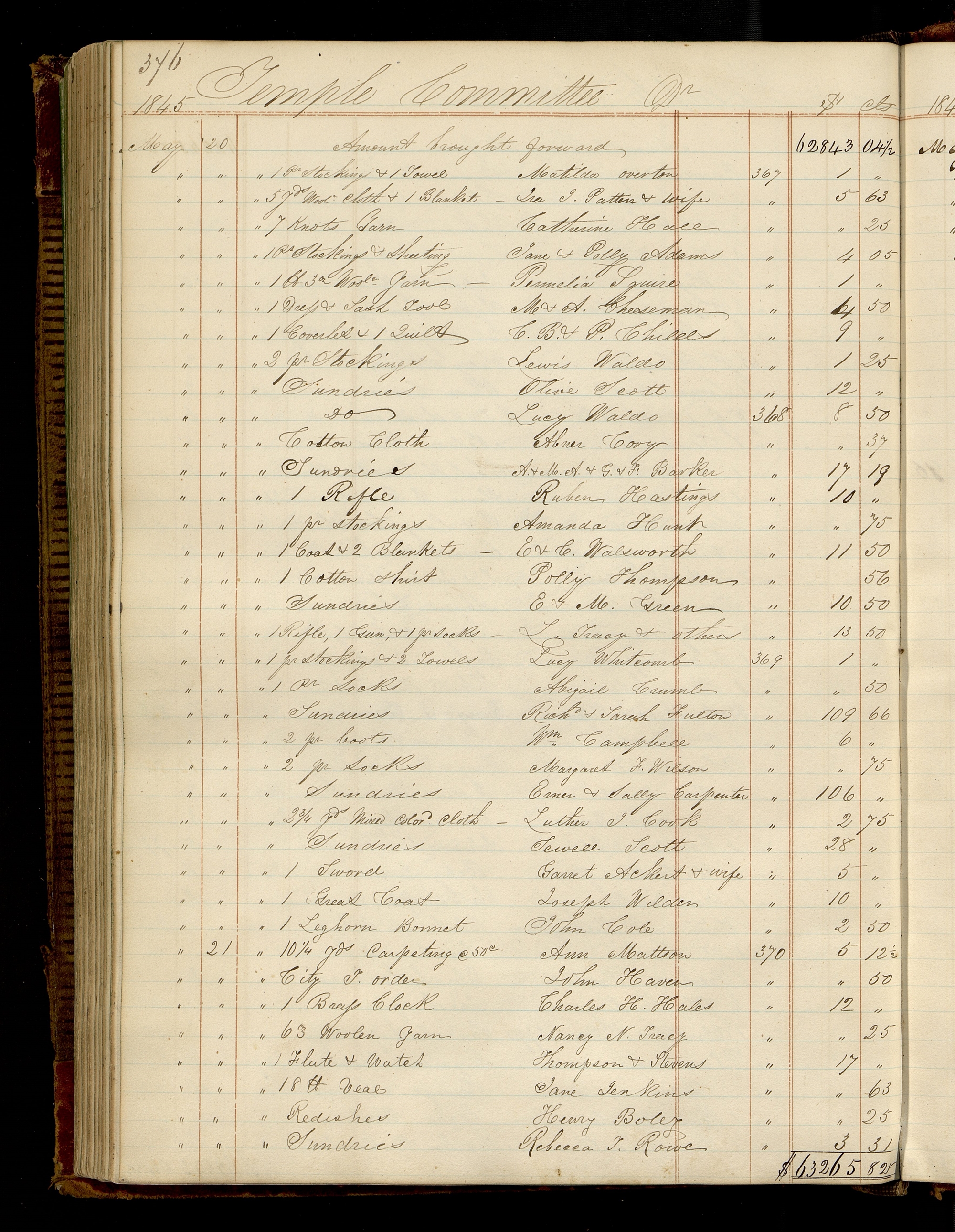 | [May 20] | [To] 1 pr stockings & 2 Towels | Lucy Whitcomb | 369 | 1.00 |