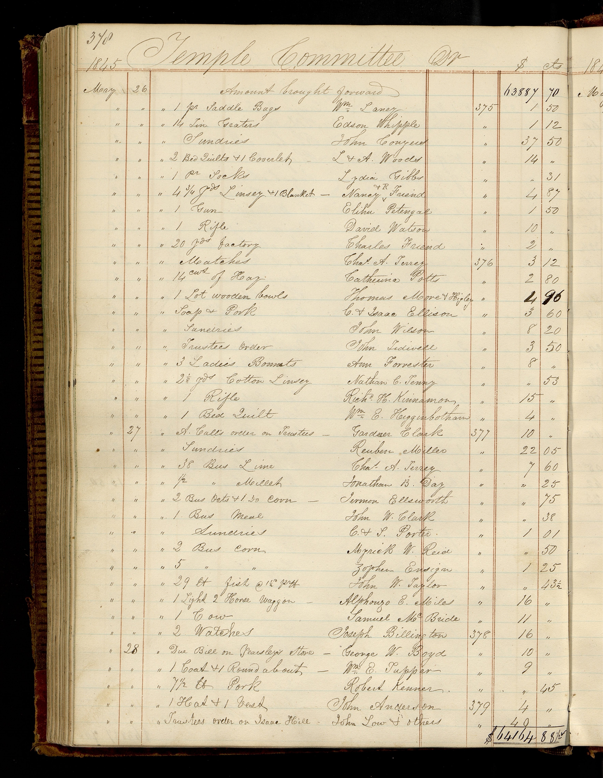 This likely led to the inscription of “Temple Committee Book A” on the spine of the volume. Some have mistaken this as an indication that this record book belonged to the Nauvoo temple committee; however, these are not temple committee records but rather accounts between the trustee-in-trust office and the Nauvoo temple committee.