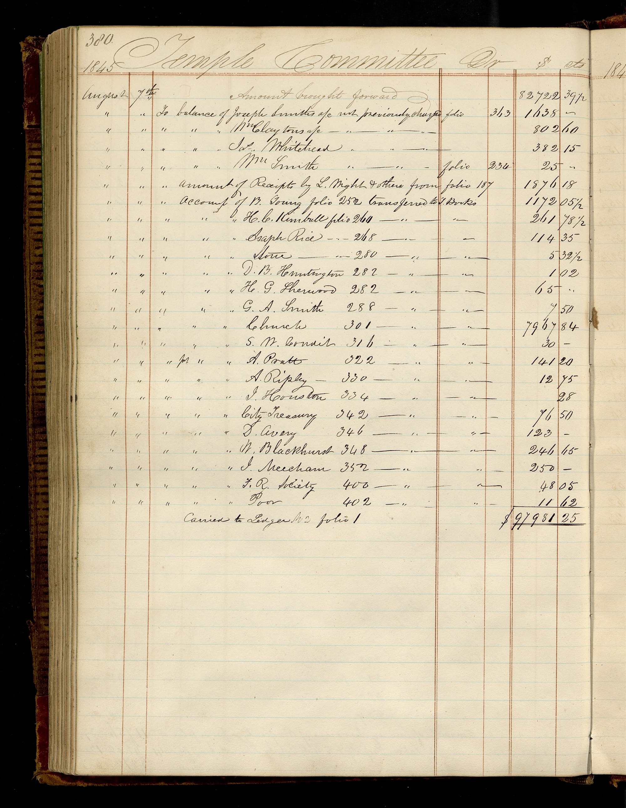 This likely led to the inscription of “Temple Committee Book A” on the spine of the volume. Some have mistaken this as an indication that this record book belonged to the Nauvoo temple committee; however, these are not temple committee records but rather accounts between the trustee-in-trust office and the Nauvoo temple committee.