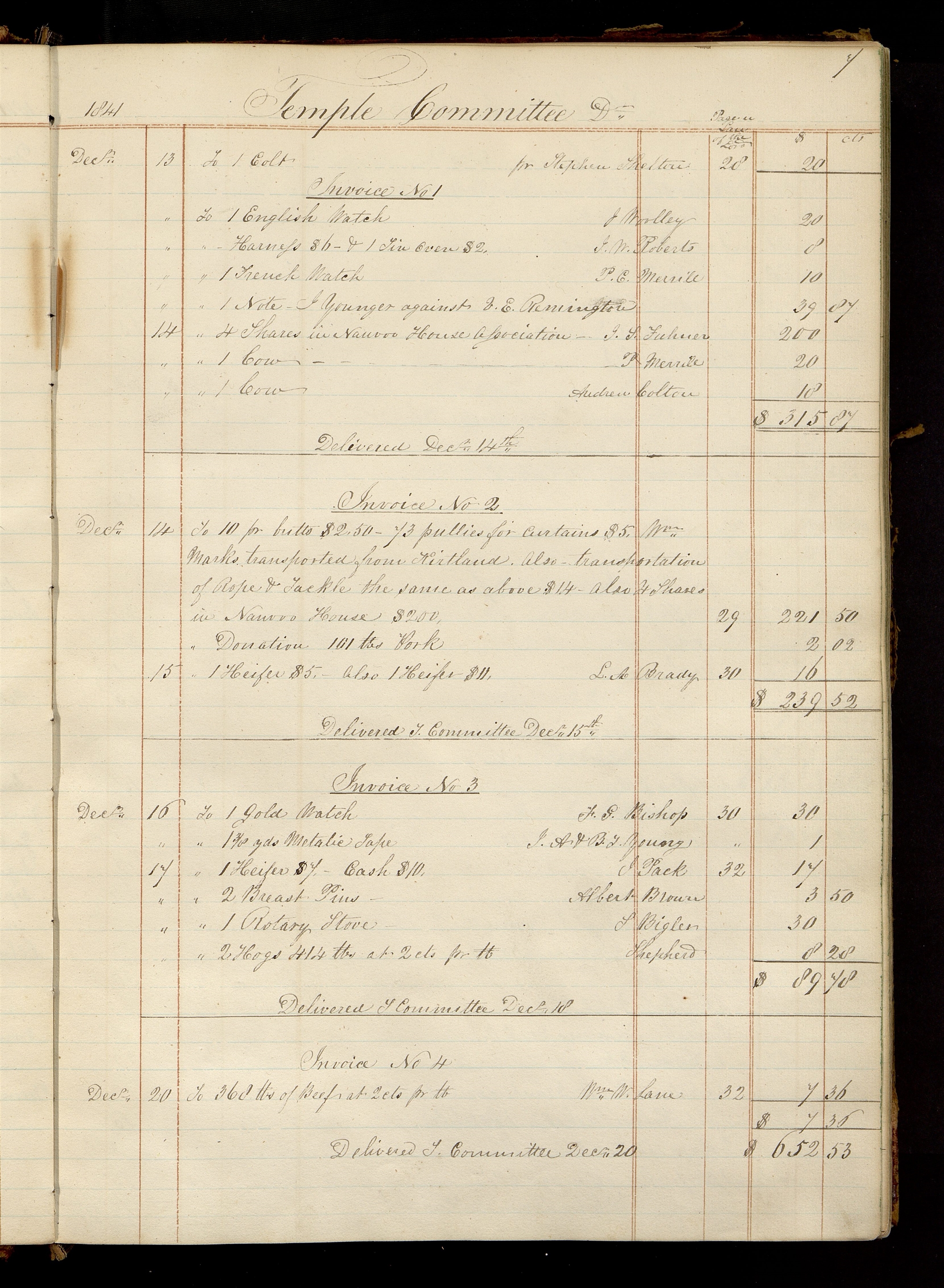 Trustee-in-Trust, Ledger A, 7–82. Two incomplete loose copies of “Invoice No 31” are extant and in the records of the Nauvoo temple committee. (Invoice, Trustee-in-Trust to Nauvoo Temple Committee, 24 Nov. 1842–8 Feb. 1843; Invoice, Trustee-in-Trust to Nauvoo Temple Committee, 24 Nov. 1842–25 July 1843.)