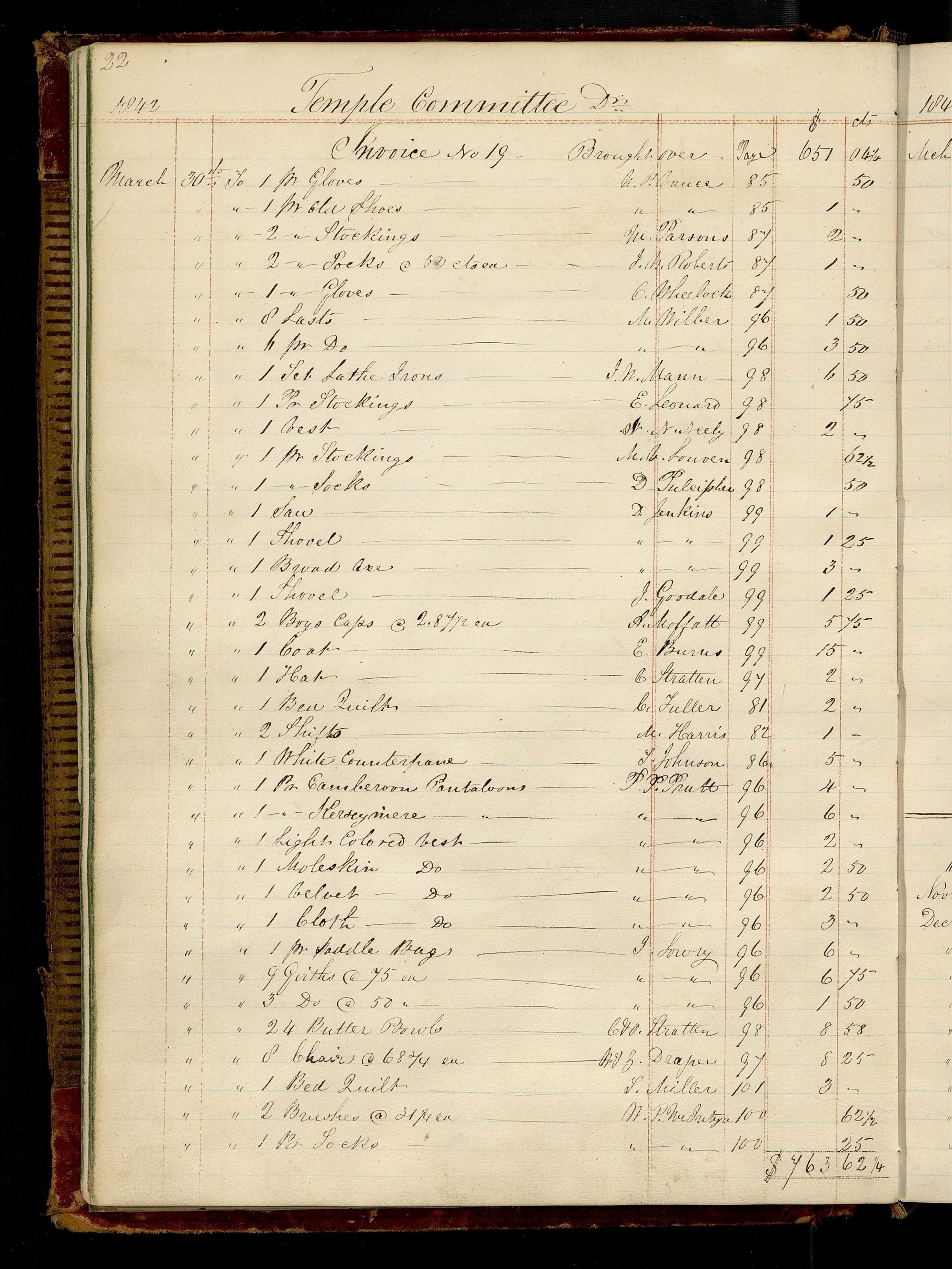 Trustee-in-Trust, Ledger A, 7–82. Two incomplete loose copies of “Invoice No 31” are extant and in the records of the Nauvoo temple committee. (Invoice, Trustee-in-Trust to Nauvoo Temple Committee, 24 Nov. 1842–8 Feb. 1843; Invoice, Trustee-in-Trust to Nauvoo Temple Committee, 24 Nov. 1842–25 July 1843.)