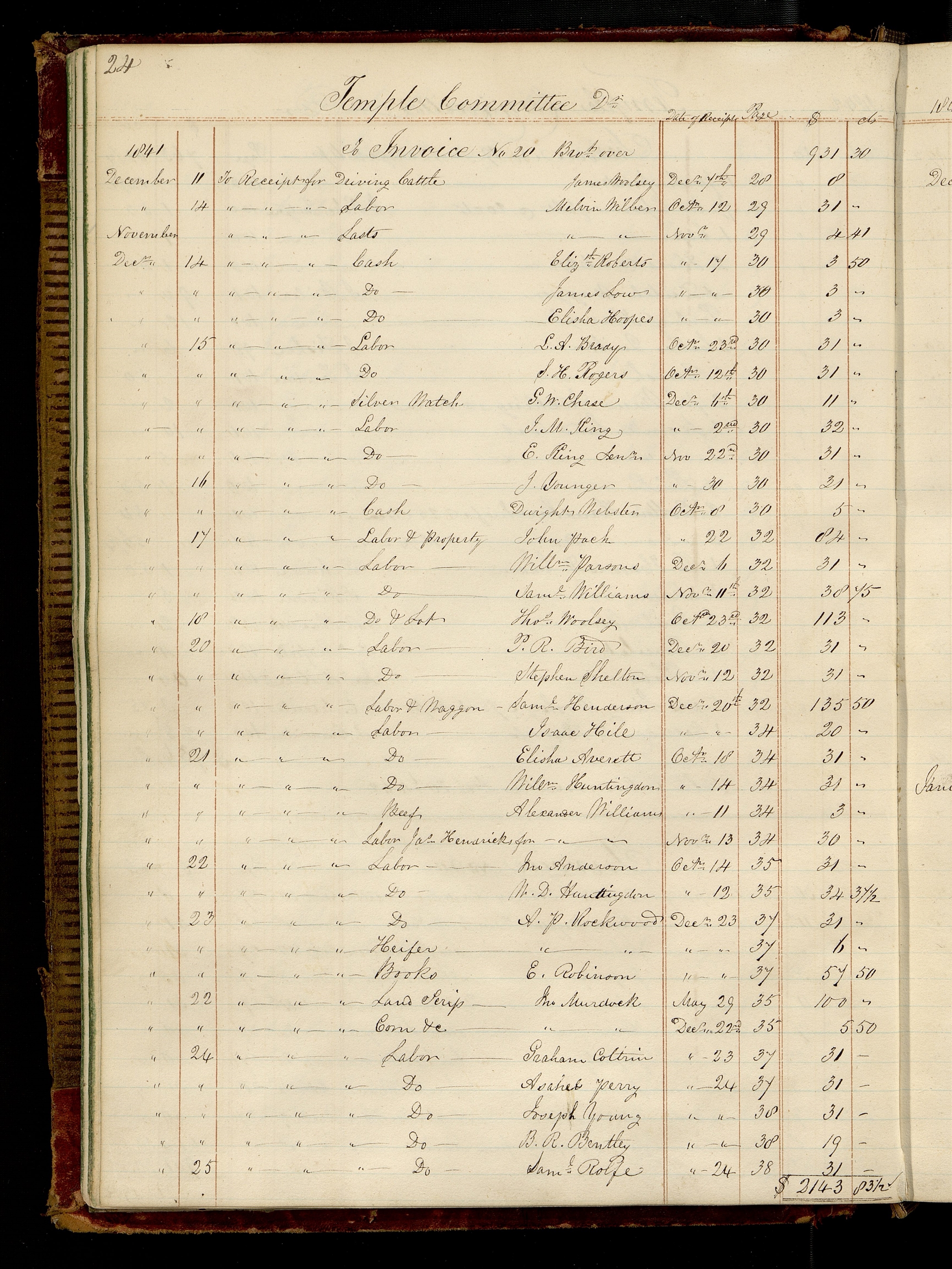 Trustee-in-Trust, Ledger A, 7–82. Two incomplete loose copies of “Invoice No 31” are extant and in the records of the Nauvoo temple committee. (Invoice, Trustee-in-Trust to Nauvoo Temple Committee, 24 Nov. 1842–8 Feb. 1843; Invoice, Trustee-in-Trust to Nauvoo Temple Committee, 24 Nov. 1842–25 July 1843.)