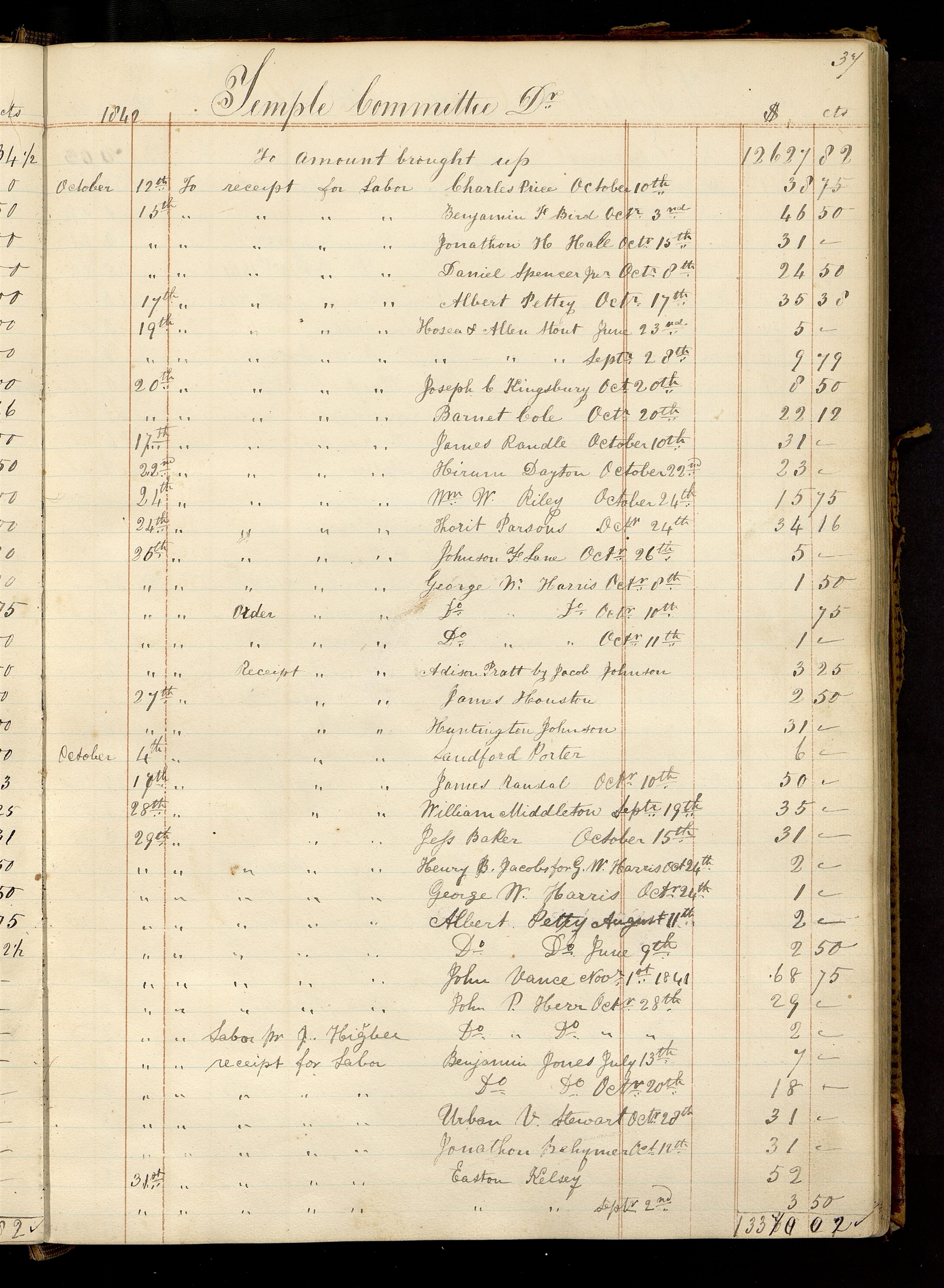 This likely led to the inscription of “Temple Committee Book A” on the spine of the volume. Some have mistaken this as an indication that this record book belonged to the Nauvoo temple committee; however, these are not temple committee records but rather accounts between the trustee-in-trust office and the Nauvoo temple committee.