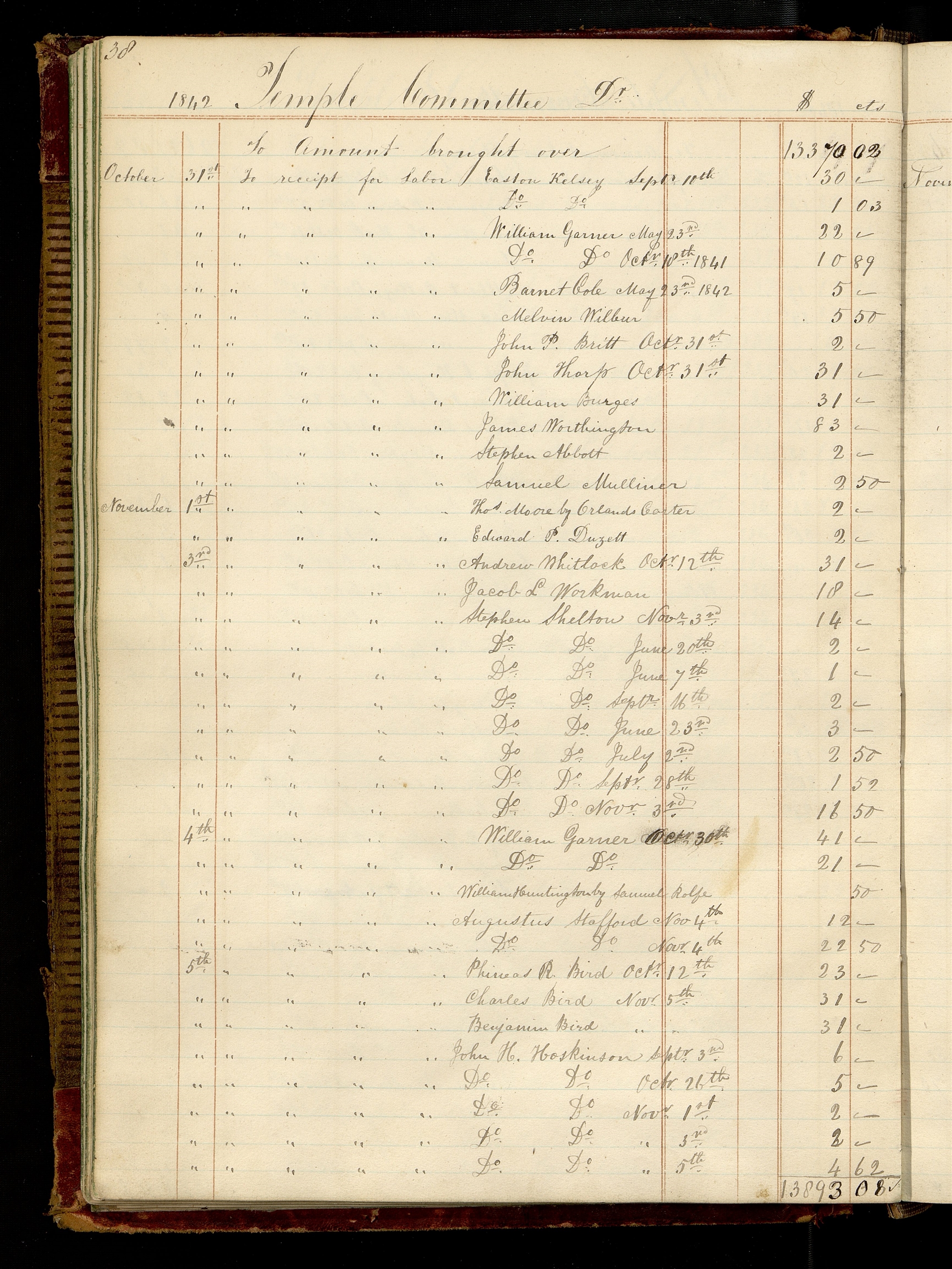 This likely led to the inscription of “Temple Committee Book A” on the spine of the volume. Some have mistaken this as an indication that this record book belonged to the Nauvoo temple committee; however, these are not temple committee records but rather accounts between the trustee-in-trust office and the Nauvoo temple committee.
