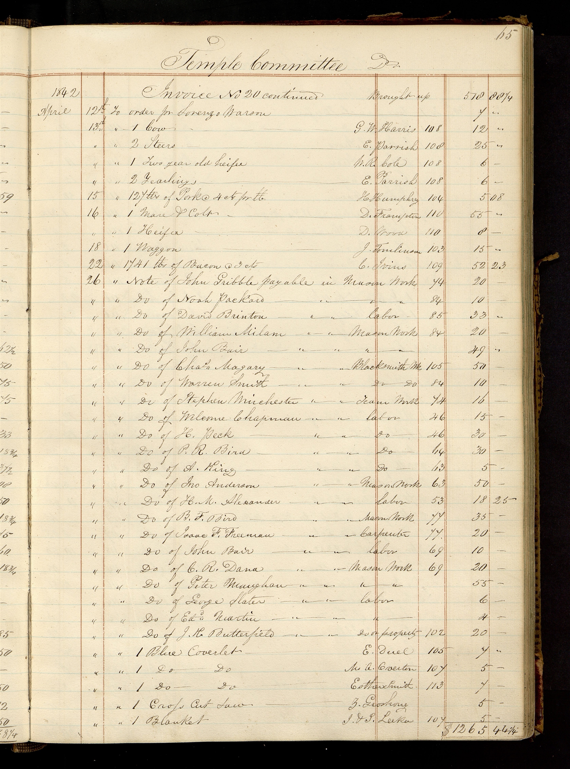 Trustee-in-Trust, Ledger A, 7–82. Two incomplete loose copies of “Invoice No 31” are extant and in the records of the Nauvoo temple committee. (Invoice, Trustee-in-Trust to Nauvoo Temple Committee, 24 Nov. 1842–8 Feb. 1843; Invoice, Trustee-in-Trust to Nauvoo Temple Committee, 24 Nov. 1842–25 July 1843.)