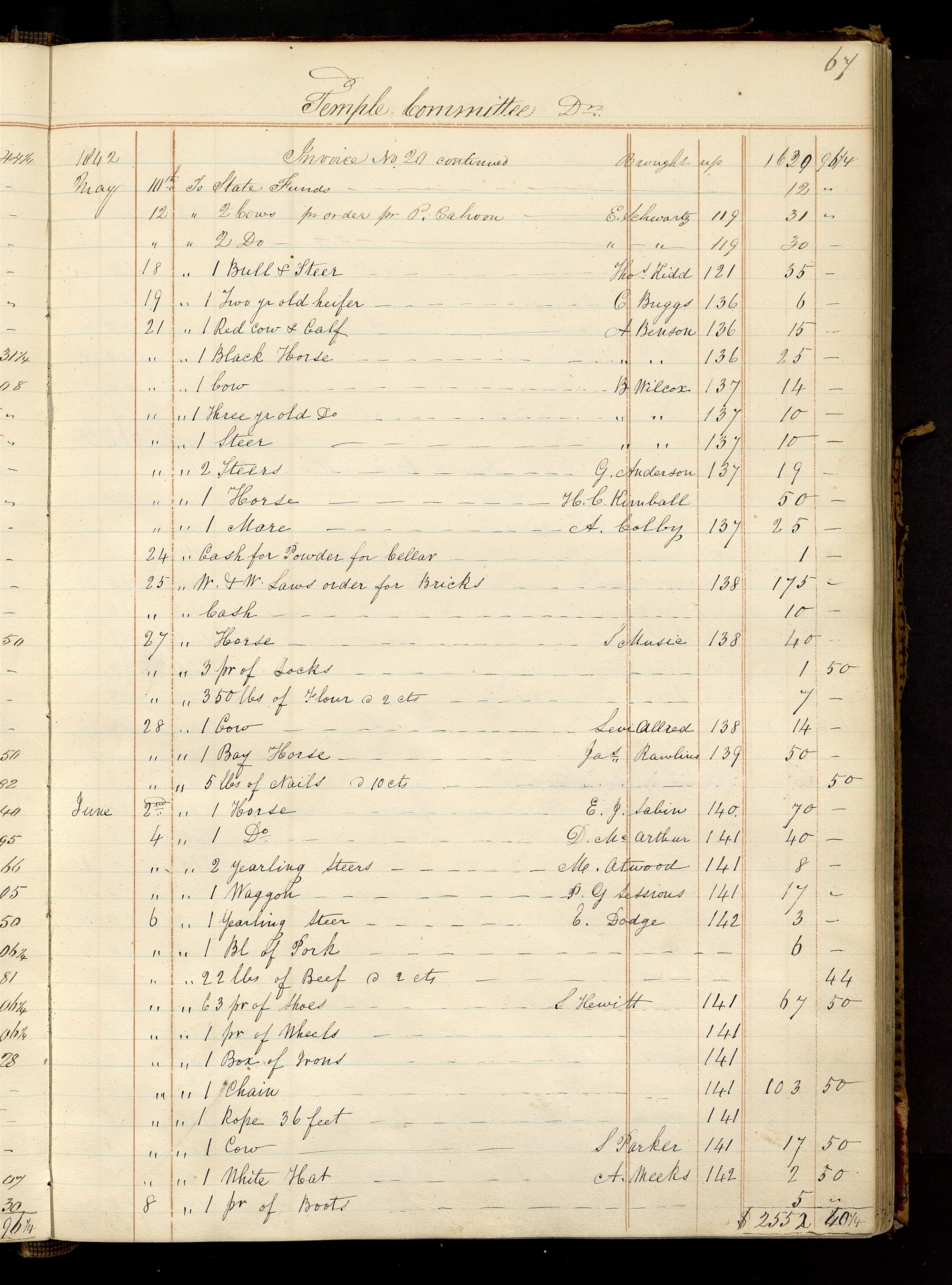 Trustee-in-Trust, Ledger A, 7–82. Two incomplete loose copies of “Invoice No 31” are extant and in the records of the Nauvoo temple committee. (Invoice, Trustee-in-Trust to Nauvoo Temple Committee, 24 Nov. 1842–8 Feb. 1843; Invoice, Trustee-in-Trust to Nauvoo Temple Committee, 24 Nov. 1842–25 July 1843.)