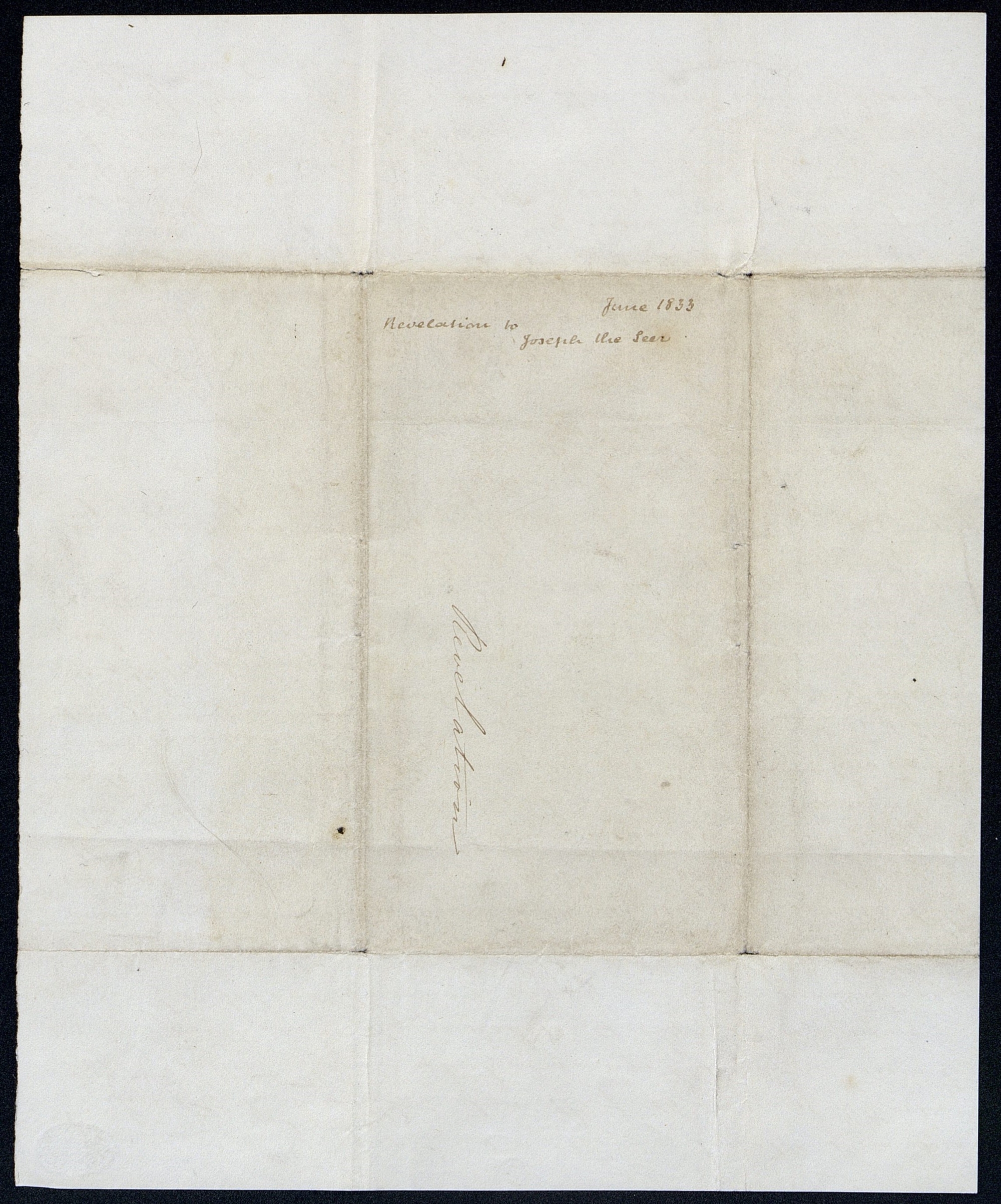 “A Revelation given to Joseph the Seer June 1833 [1830],” Visions of Moses, [, Seneca Co., NY, or , Susquehanna Co., PA (or possibly , Broome Co., or , Ontario Co., NY)], June 1830. Version copied [ca. 1840]; unidentified handwriting; six pages; CHL.