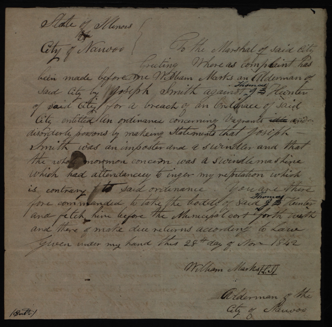 Greeting Where as complaint has been made before me an Alderman of said by Joseph Smith against <Thomas J> B Hunter of said for a breach of an Ordinace of said entitled An ordinance concerning Vagrants idle and disorderly persons by makeing statements that Joseph— Smith was an imposter and a swindler and that the whole mormon concern was a swindle mashine which had attendancy to inger [injure] my reputation which is contrary to said ordinance You are therefore commanded to take the boddy of said <Thomas J> B Hunter and fetch him before the Municipal cort forth with and there of make due returns according to Law