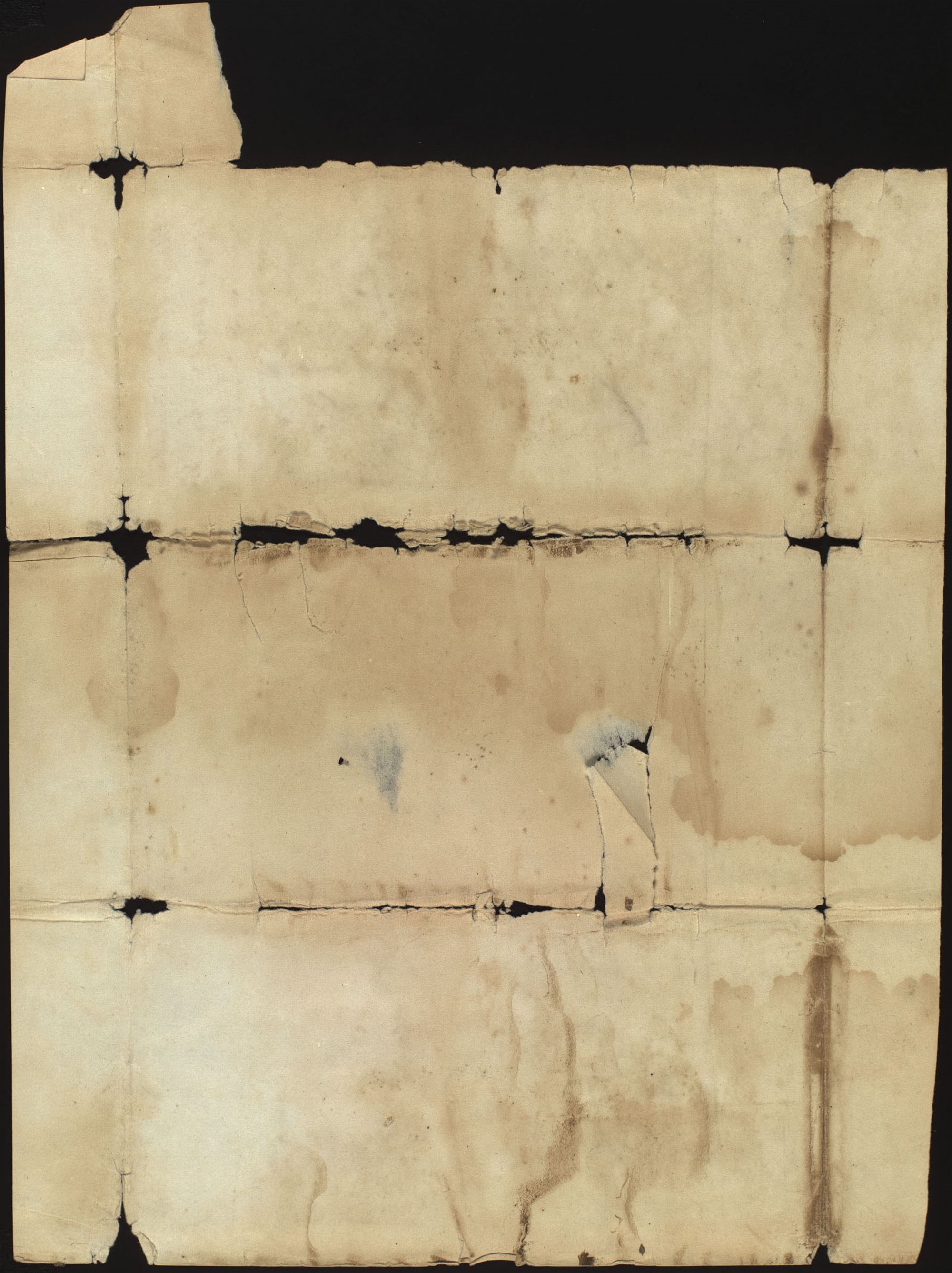 Single sheet measuring 12⅛ × 8⅞ inches (31 × 23 cm). The sheet wrapped two letters dated 15 February 1844 from and others in . The wrapper and letters were folded three times horizontally and twice vertically, addressed, and sealed with two adhesive wafers (not extant). Marked water damage resulted in weakened folds on the wrapper and complete separation and loss of a portion of it.